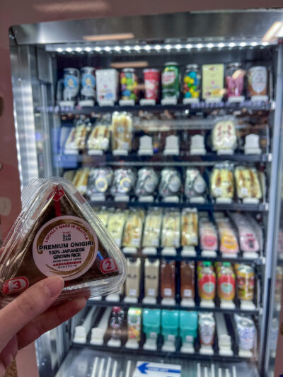 I spotted some onigiri in a vending machine at my new gate. It was way overpriced ($8!) and I wasn’t going to get it, but then they called me to the desk for a document check and I lost my seat, so I figured I should probably get the wee triangle: