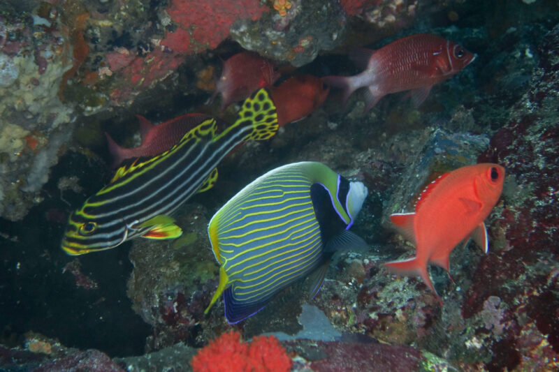 A collection of fish I tried and failed to photograph individually- (L-R) Sweetlips, Emperor angelfish, Whitetip soldierfish: