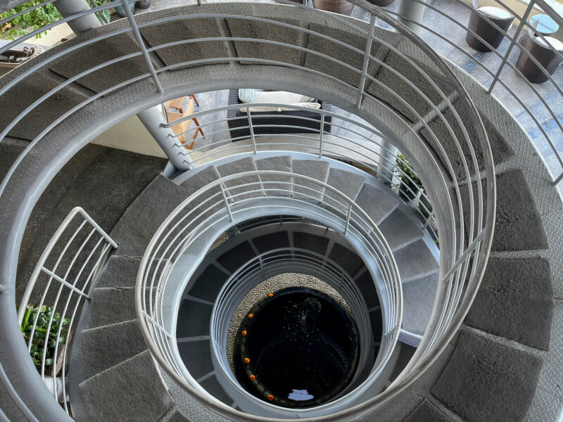 I was starting to get a little hungry, but mostly, I wanted something refreshing to drink, so I headed over to the restaurant and down this cool spiral staircase: