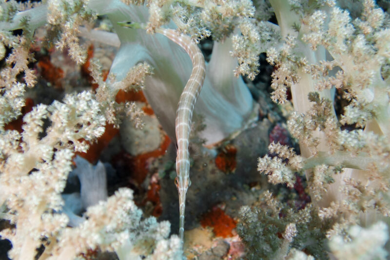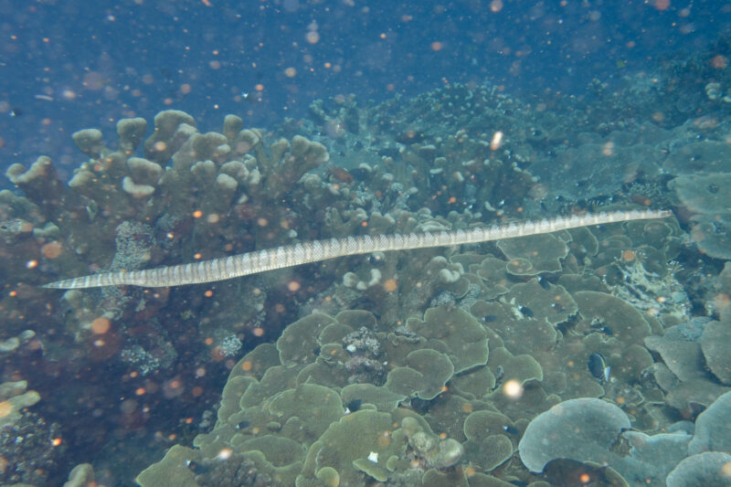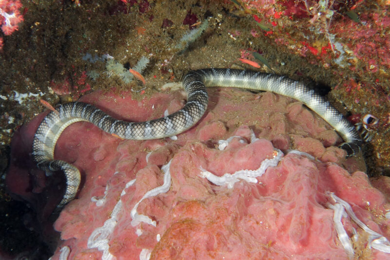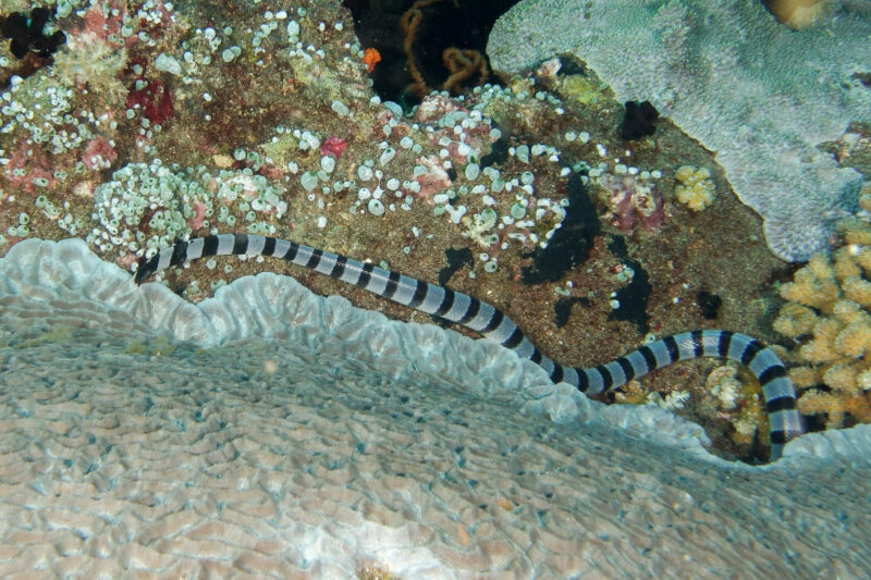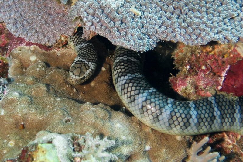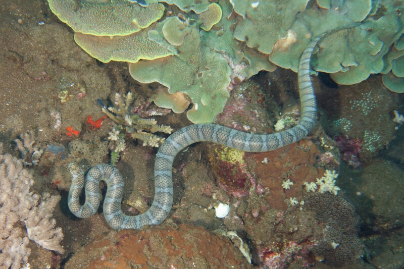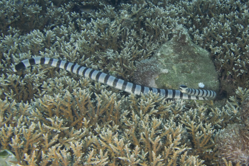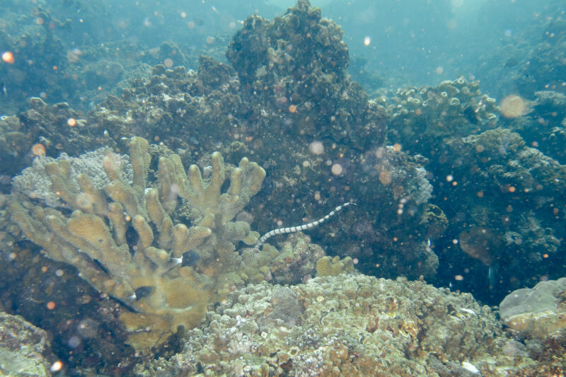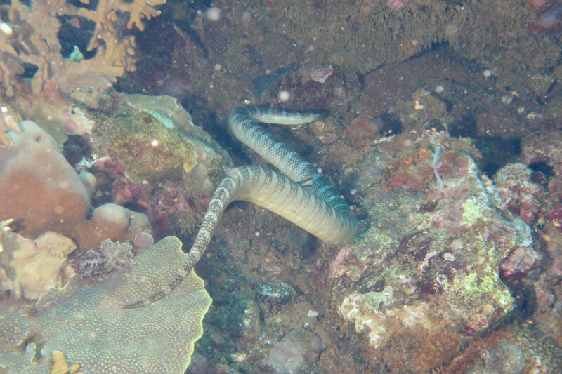 There are a TON of these sea kraits wiggling around! They are venomous, but fairly docile, so as long as you don’t mess with them, you’re probably fine. Plus, their fangs are small and I’m wearing like 5mm of neoprene. Totally safe 🙂