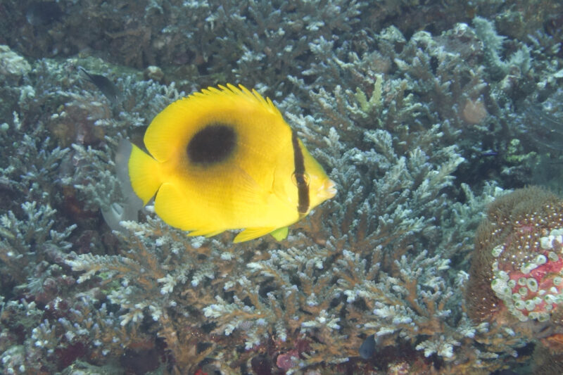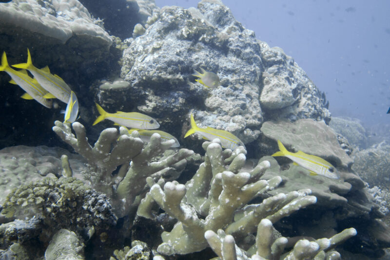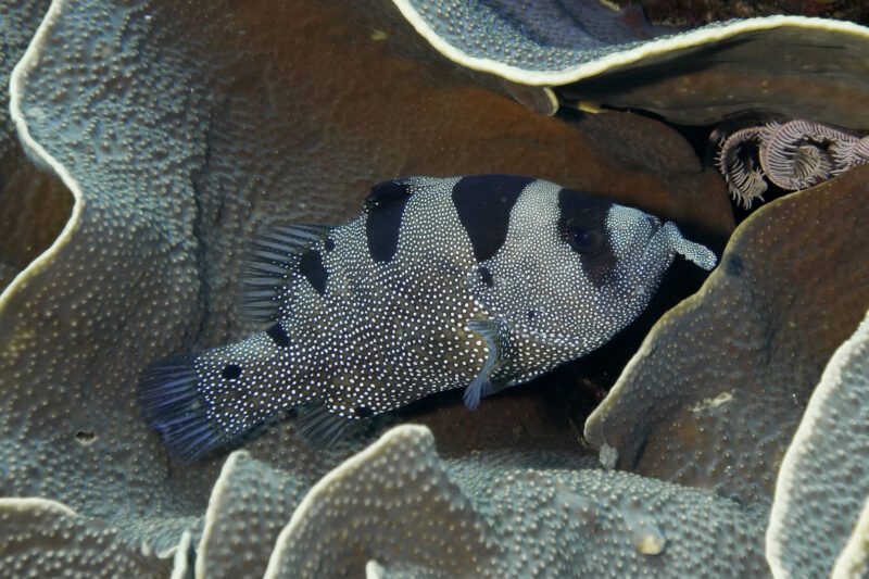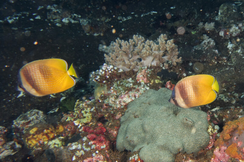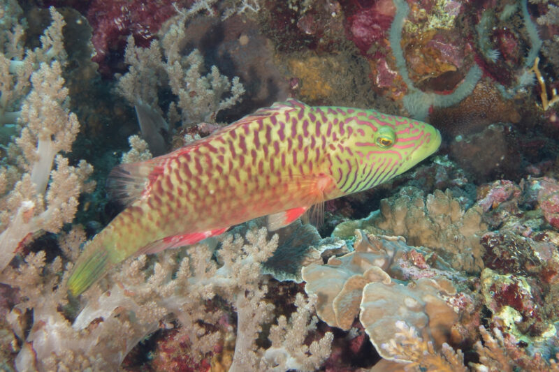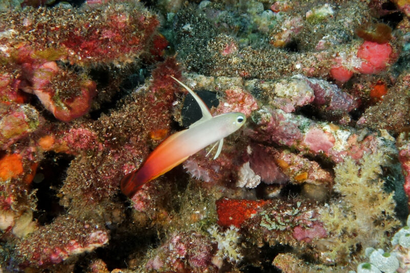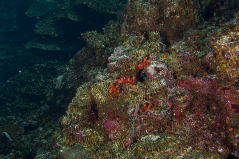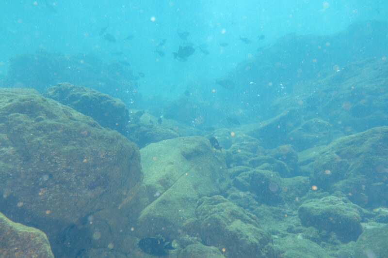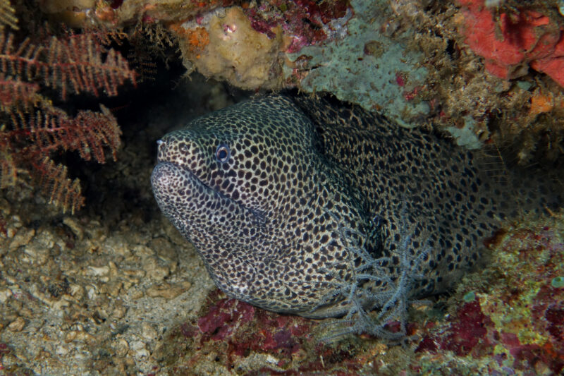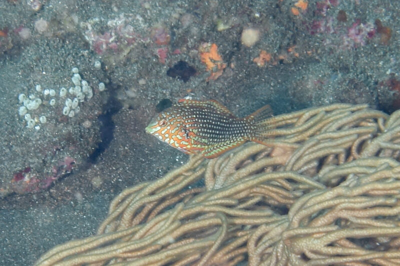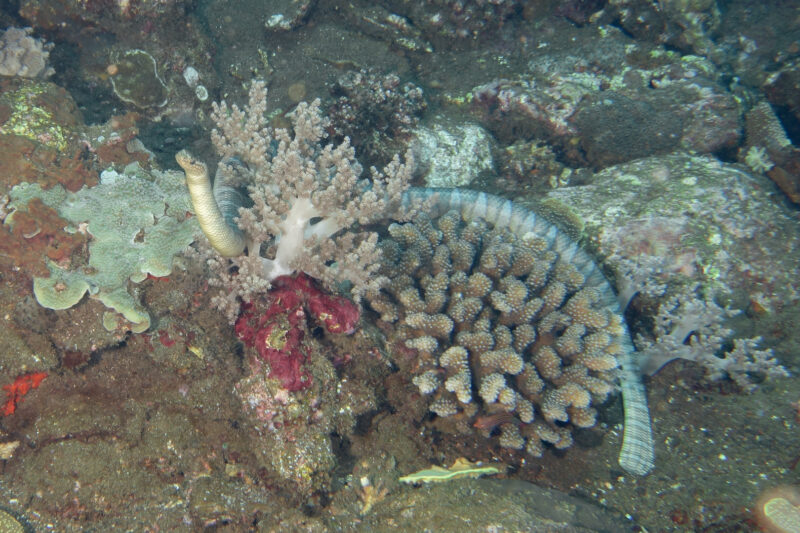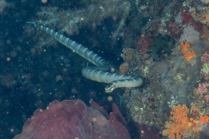 Pictures from this dive turned out strangely dark- did my strobe cable come disconnected? Unfortunate, since there were a lot of snakes out hunting, but anything beyond 5′ or 6′ turned out like this: