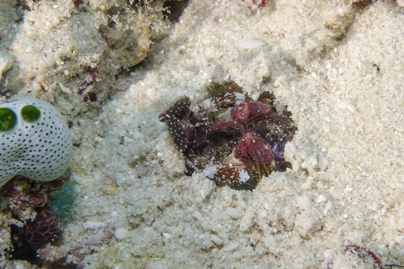 Some sort of mantis shrimp hiding in his hole: