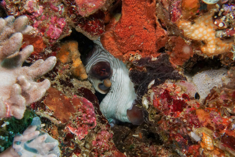 Octopus hiding in a hole in the reef: