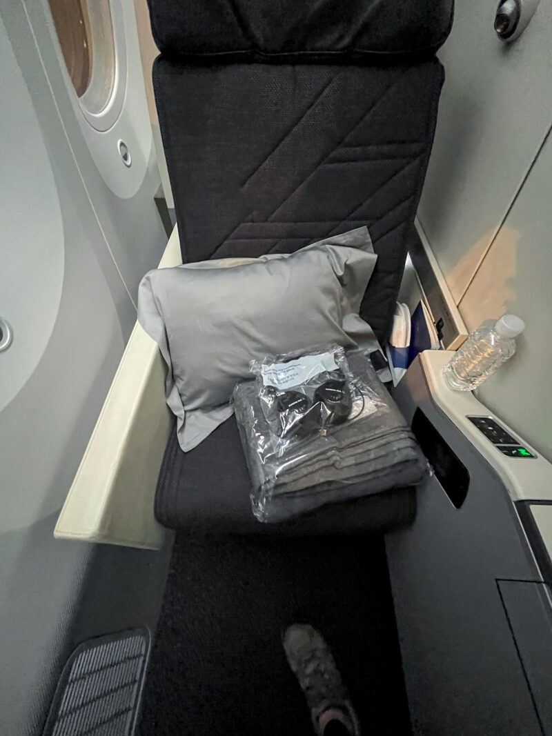 It comes with a pillow, blanket and headphones, and so much legroom!!!
