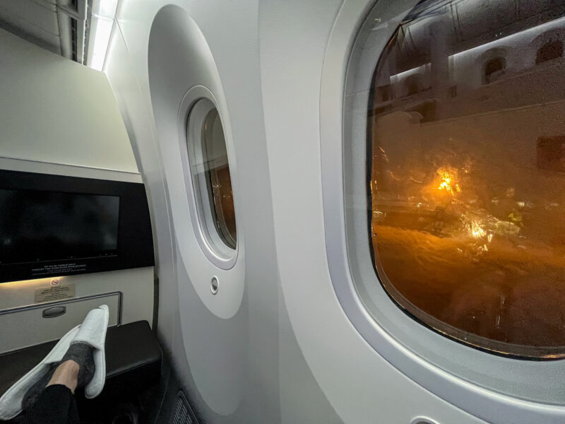 They even asked if they should wake me for food (YES!). However, shortly after the doors closed it started raining, and lightning, and the wind picked up, rocking the plane back and forth: