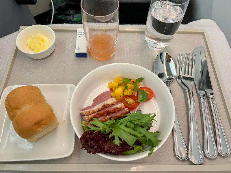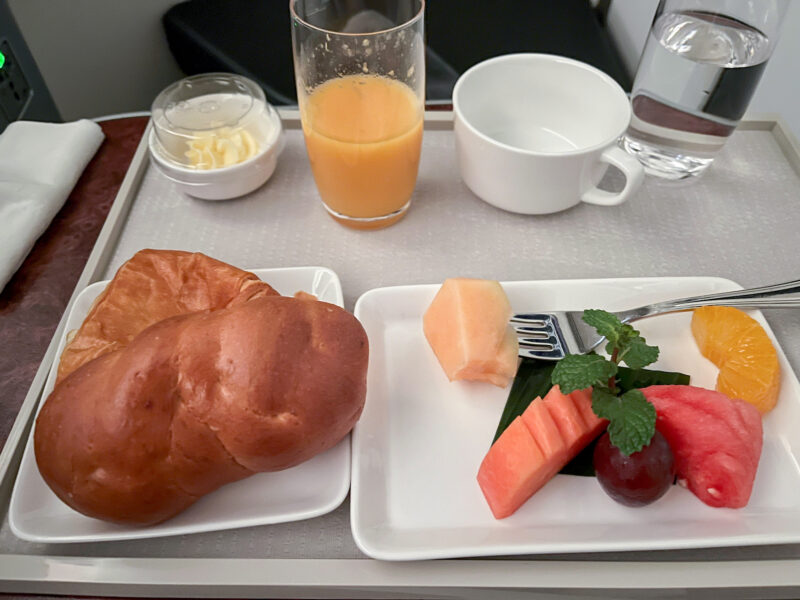 I even slept through the mid-flight snack, so I was very happy when breakfast came around. I wasn’t excited by any of the options, so I asked if they maybe had any rolls left over from dinner and they brought me this: