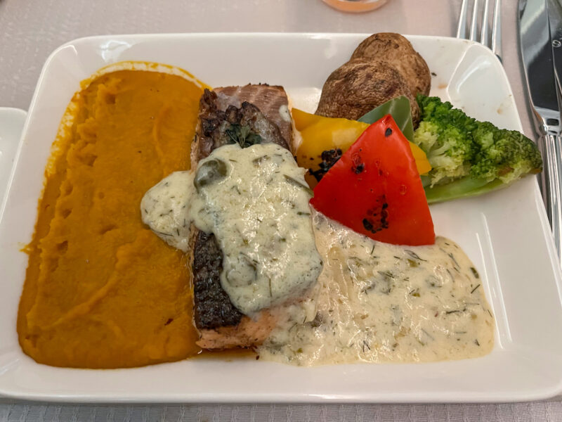 For my main course, I chose salmon in a caper/dill sauce with what I think is sweet potatoes? and grilled veggies: