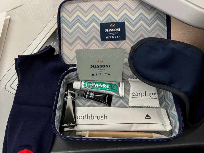 It come with 3 pillows (that gray memory foam one in the front, a rolly one behind it- which turns into a sleeping pad, and a regular one in the zipped bag underneath), a blanket (also in the zipped bag), slippers, headphones and an amenity kit: