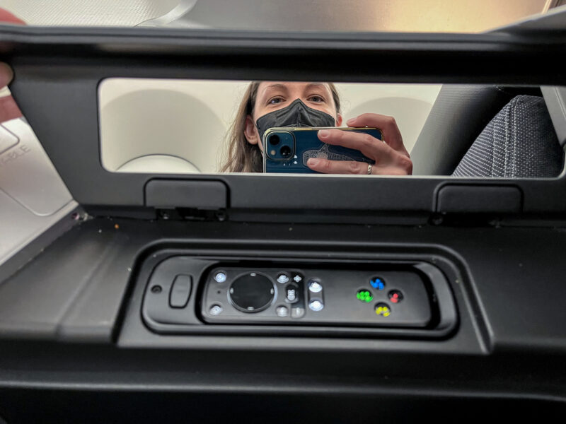 The screen is closer on this flight, but I’ve still got a clicker and a little mirror (unexpected):