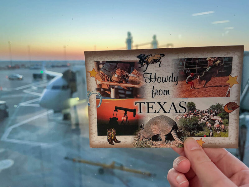 So I downed a giant coffee as soon as I landed in Dallas, then went in search of a postcard for my niece’s class project: