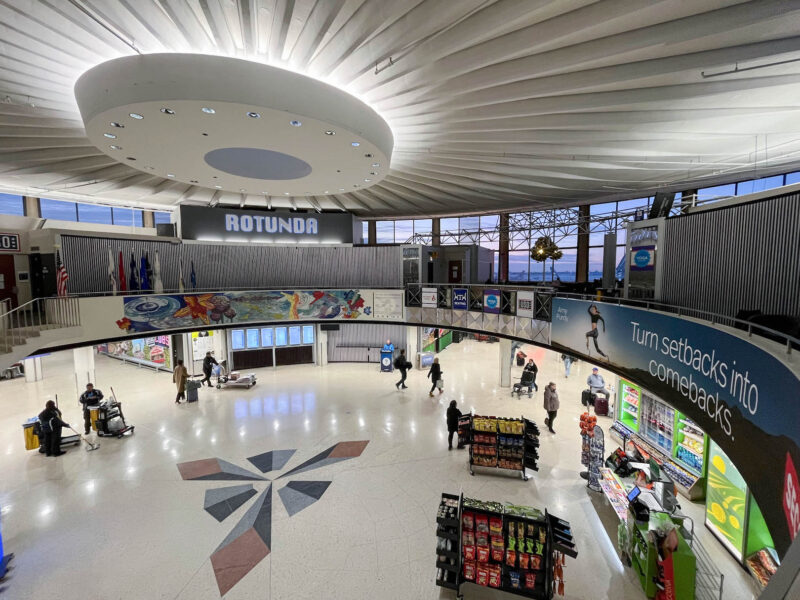 Not a big deal- I’ve got an 8.5 hour layover, which is longer than my next flight over to Europe, so I spent the first couple hours walking the airport, where I discovered this rotunda area with quiet seating overlooking the runways:
