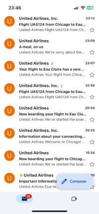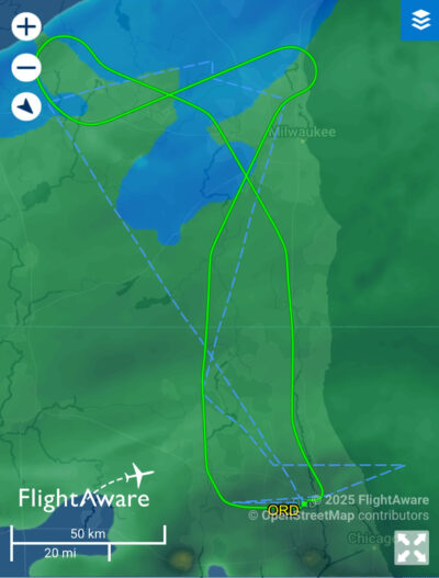 But we eventually got airborne AND I got a row to myself (after I asked if could move to the empty row behind me). I had just tipped over and was dozing off when they came on the overhead: there’s an issue with our left wing deicer. Not a problem in warm weather, or at lower latitudes, but it’s cold and borderline snowy back home; we can’t safely land there. So we turned back around and headed back to Chicago: